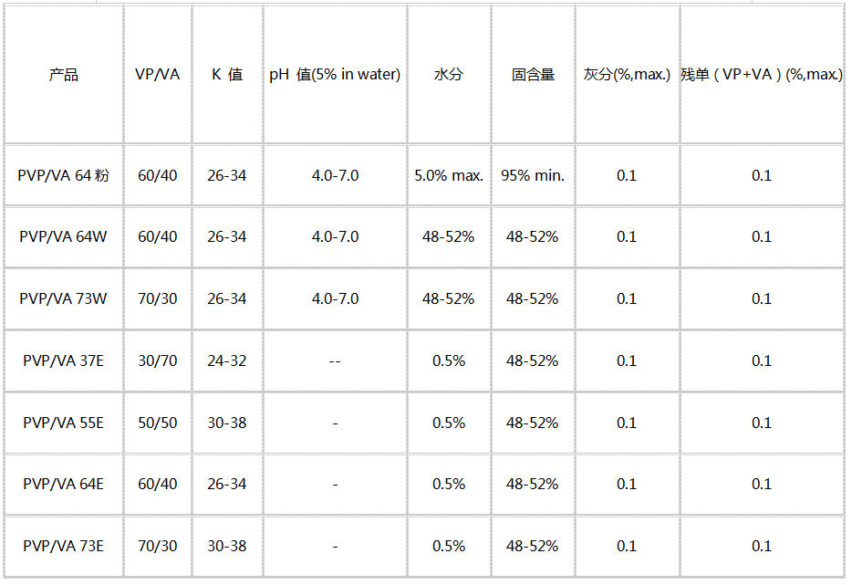 產品特性:VP/VA 產品由不同比例的N-乙烯基吡咯烷酮和醋酸乙烯共聚而成的共聚物,以粉末、液體(包括水溶液和酒精溶液)的形態(tài)存在。溶于水、乙醇等多種有機溶劑。具有良好的成模性,且膜堅硬、光澤好、易水洗。